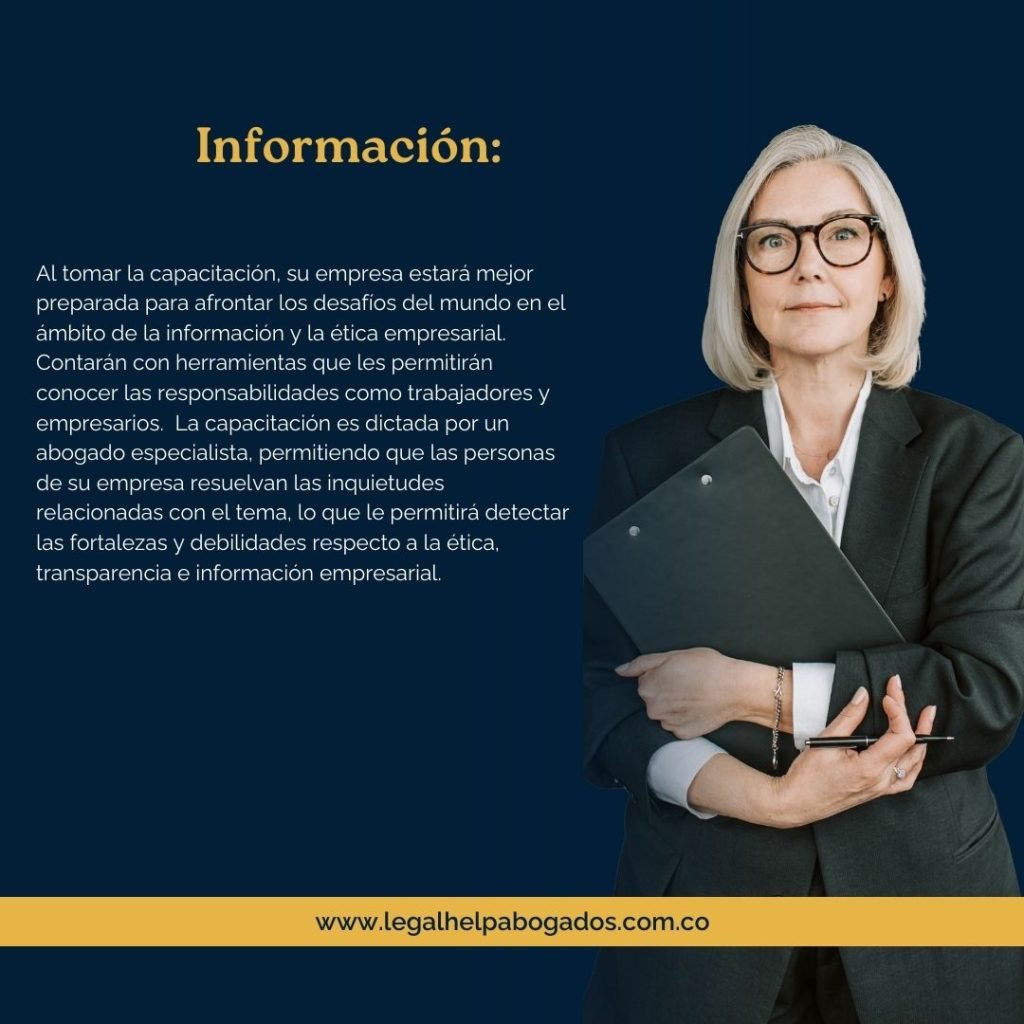 Al tomar la capacitación, su empresa estará mejor preparada para afrontar los desafíos del mundo en el ámbito de la información y la ética empresarial. Contarán con herramientas que les permitirán conocer las responsabilidades como trabajadores y empresarios. La capacitación es dictada por un abogado especialista, permitiendo que las personas de su empresa resuelvan las inquietudes relacionadas con el tema, lo que le permitirá detectar las fortalezas y debilidades respecto a la ética, transparencia e información empresarial.